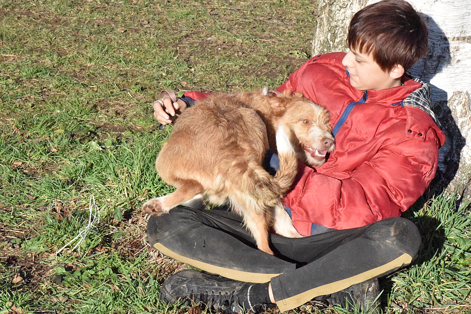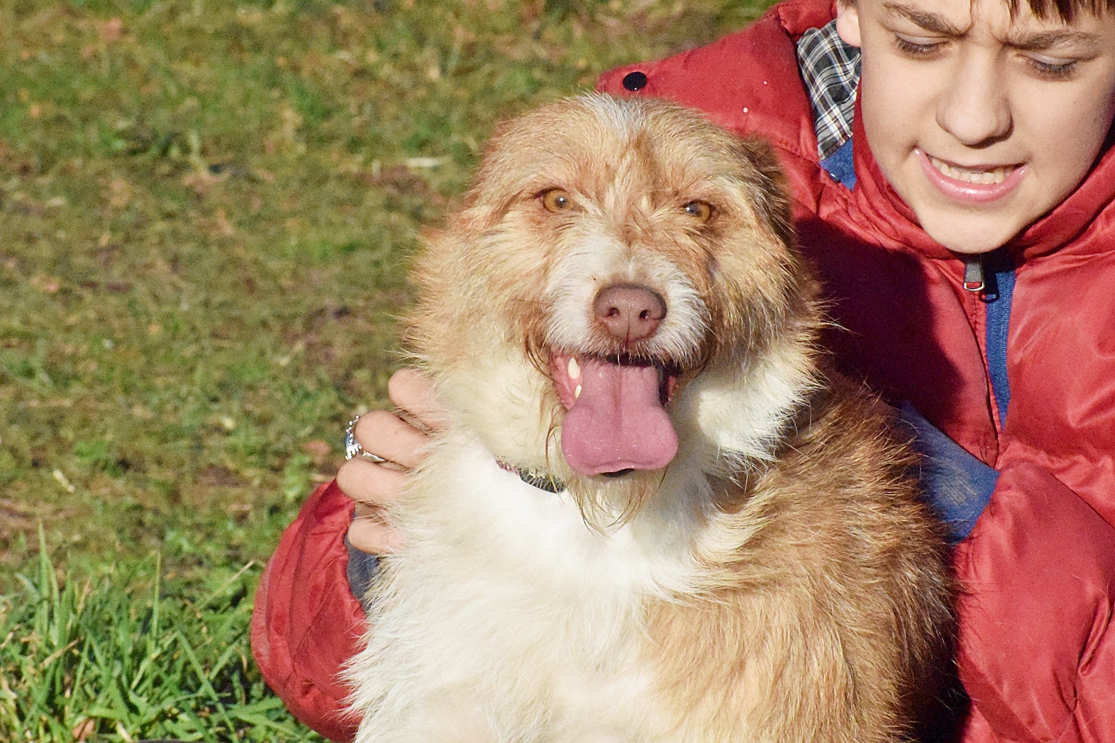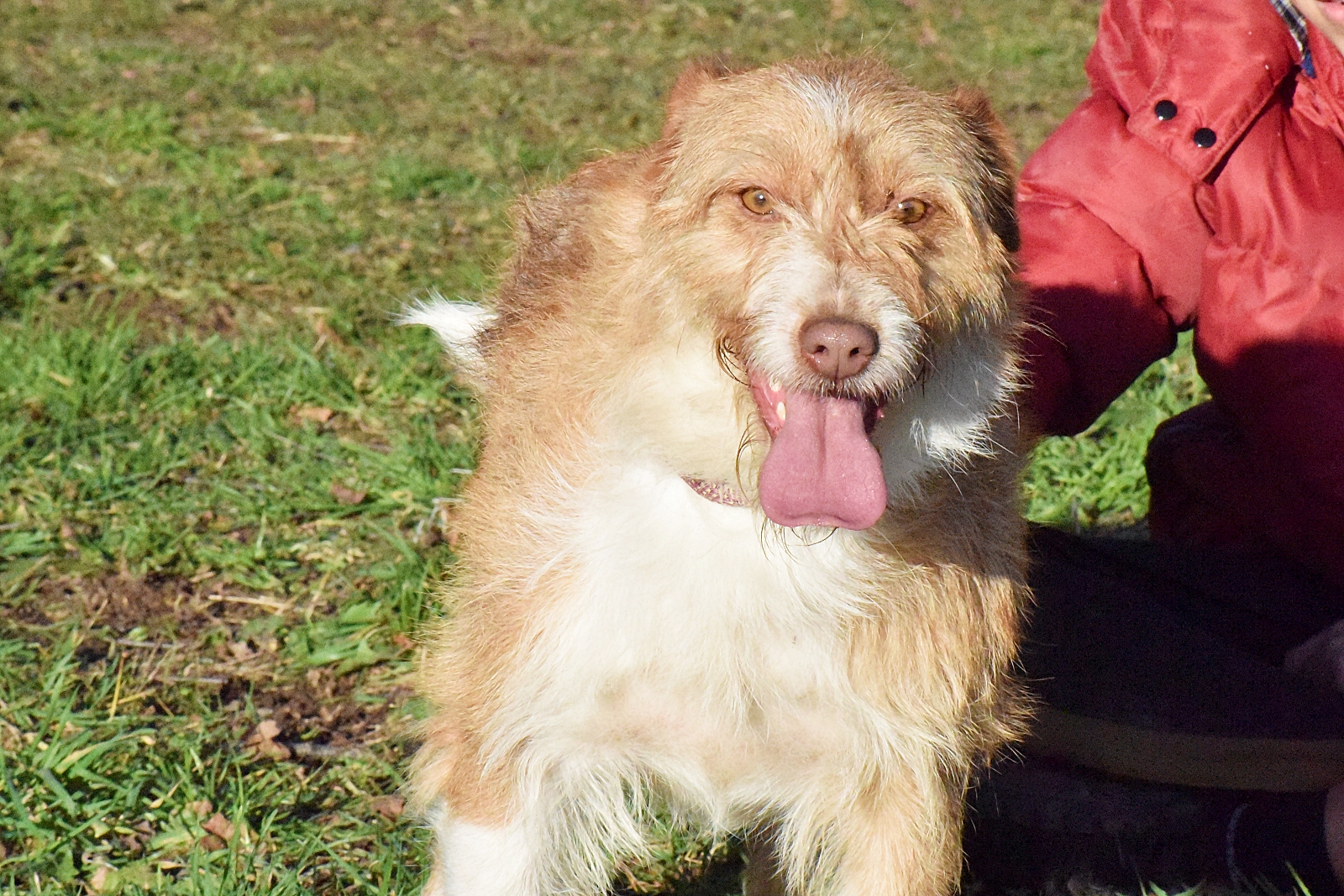 Rio es un perrito de raza mestiza, pelo semilargo y tamaño pequeño – mediano. Es muy joven, alegre, simpático y noble.